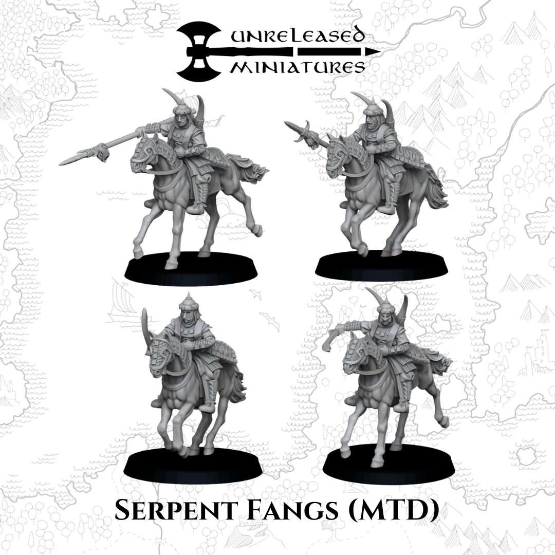 El pack contiene 4 miniaturas de Colmillos de Serpiente Montados, la imagen muestra los archivos stl.