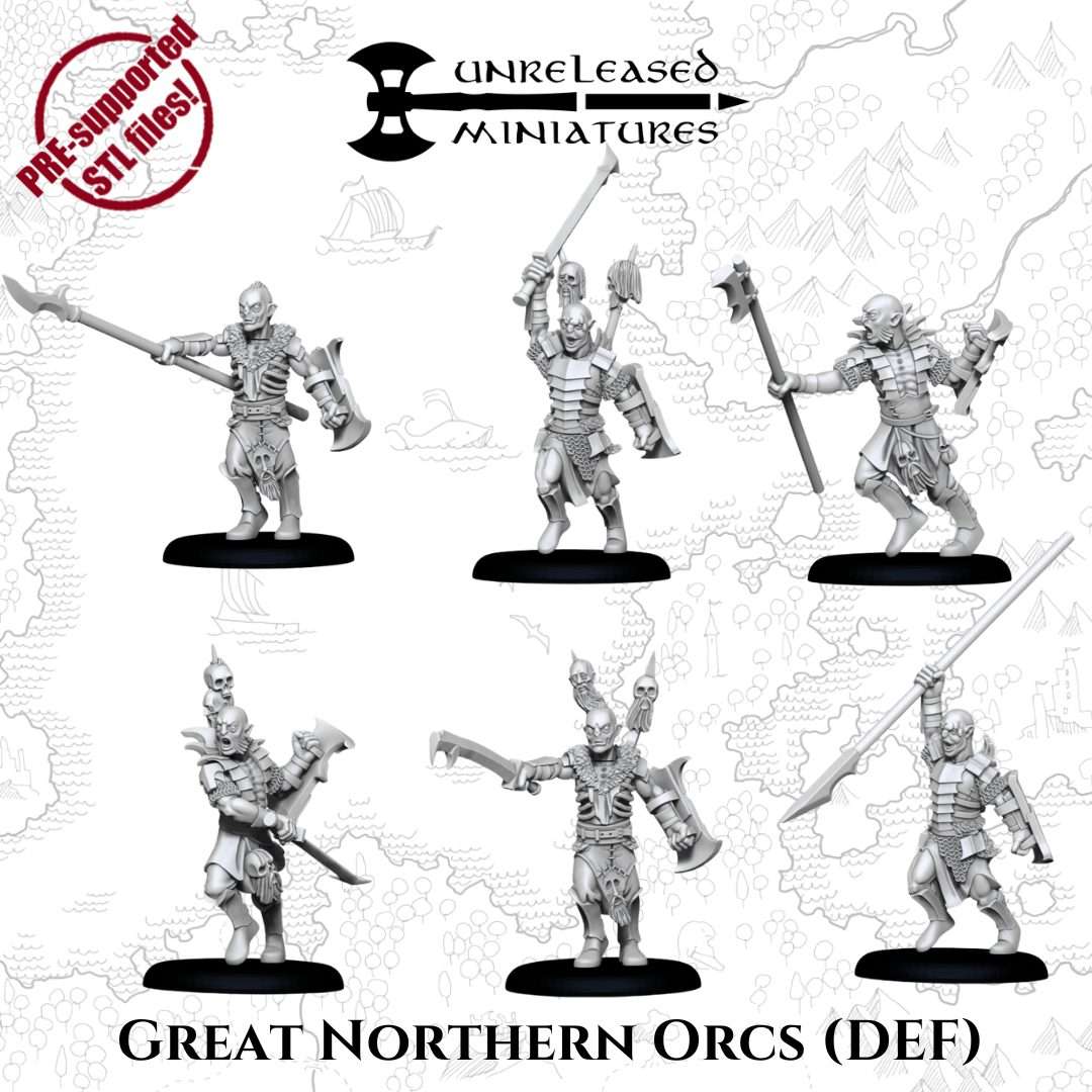 El pack contiene 6 miniaturas de Grandes Orcos del Norte 2, la imagen muestra los archivos stl.