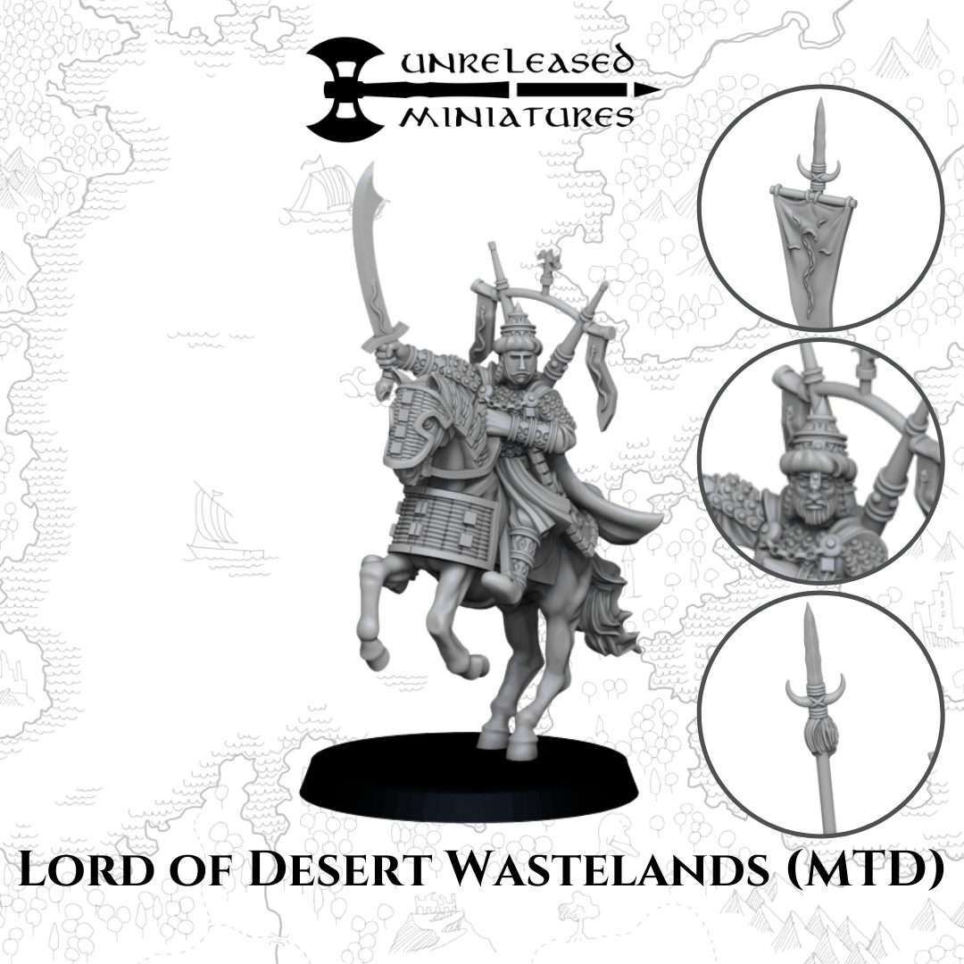 El pack contiene 1 miniatura de Señor de los Páramos del Desierto Montado, la imagen muestra los archivos stl.