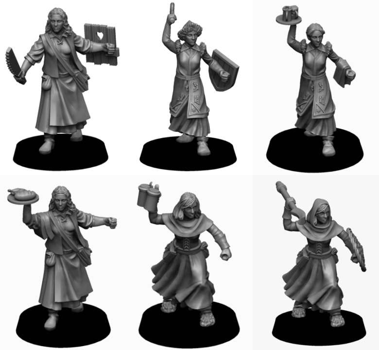 El pack contiene 6 miniaturas de Taberneras y Milicianas 1, la imagen muestra los archivos stl.