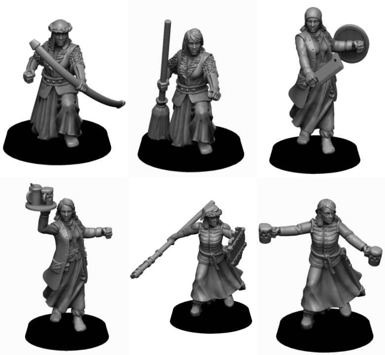 El pack contiene 6 miniaturas de Taberneras y Milicianas 2, la imagen muestra los archivos stl.