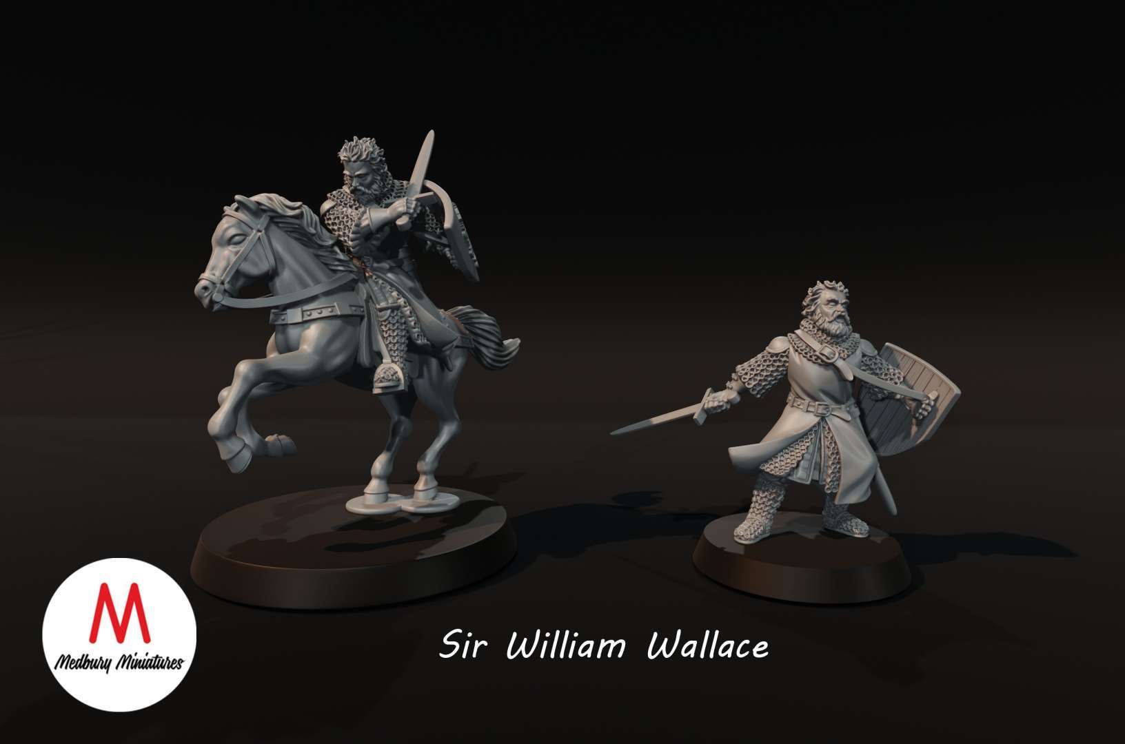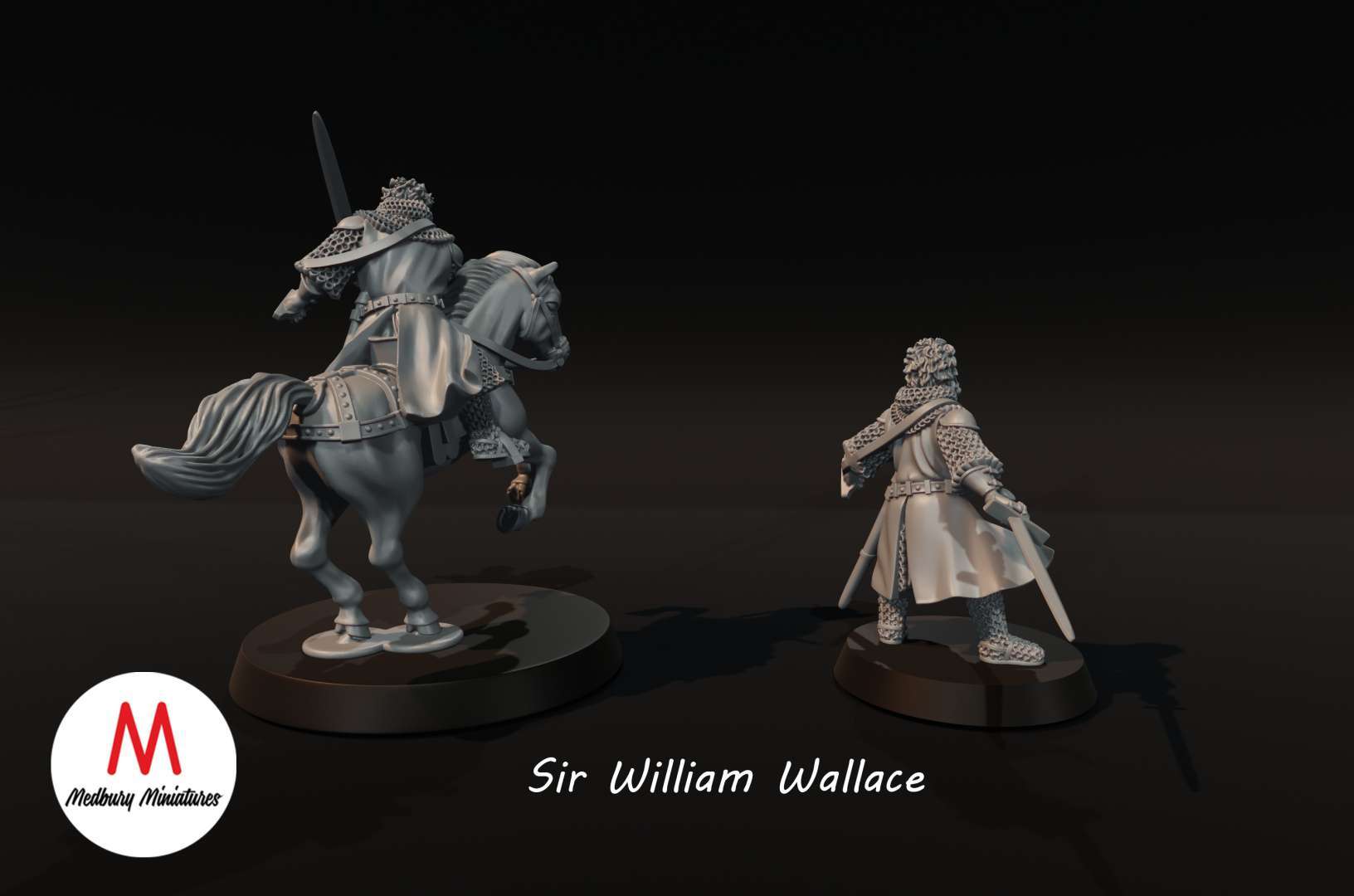 El pack contiene 2 miniaturas de William Wallace, una a pie y a caballo, destacado líder militar escoces durante el siglo XIII, la imagen muestra los archivos stl.